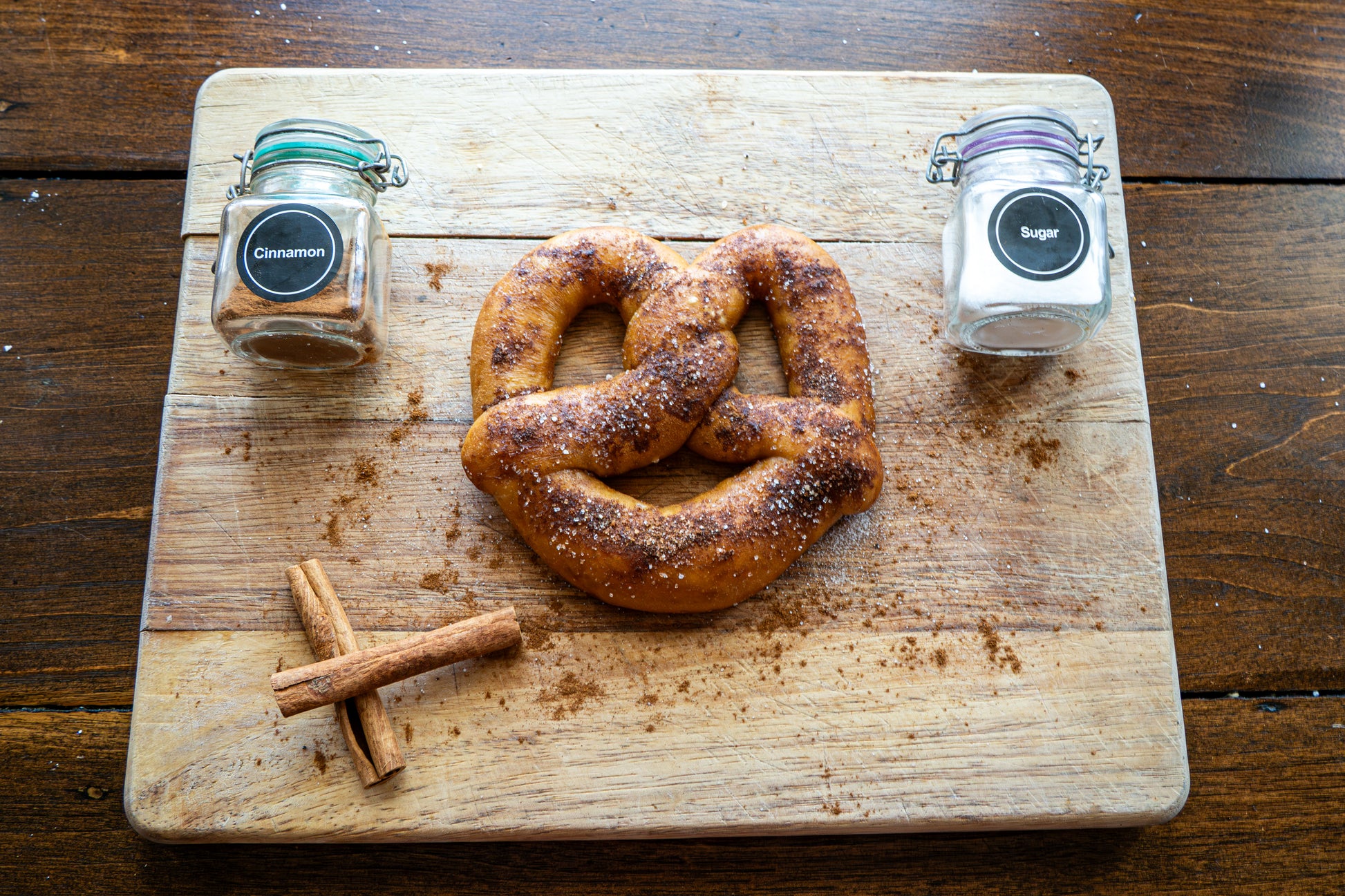 A soft pretzel brushed with real butter, then sprinkled with a cozy blend of cinnamon, sugar, vanilla, and just a few pops of pretzel salt for the perfect sweet-salty bite.